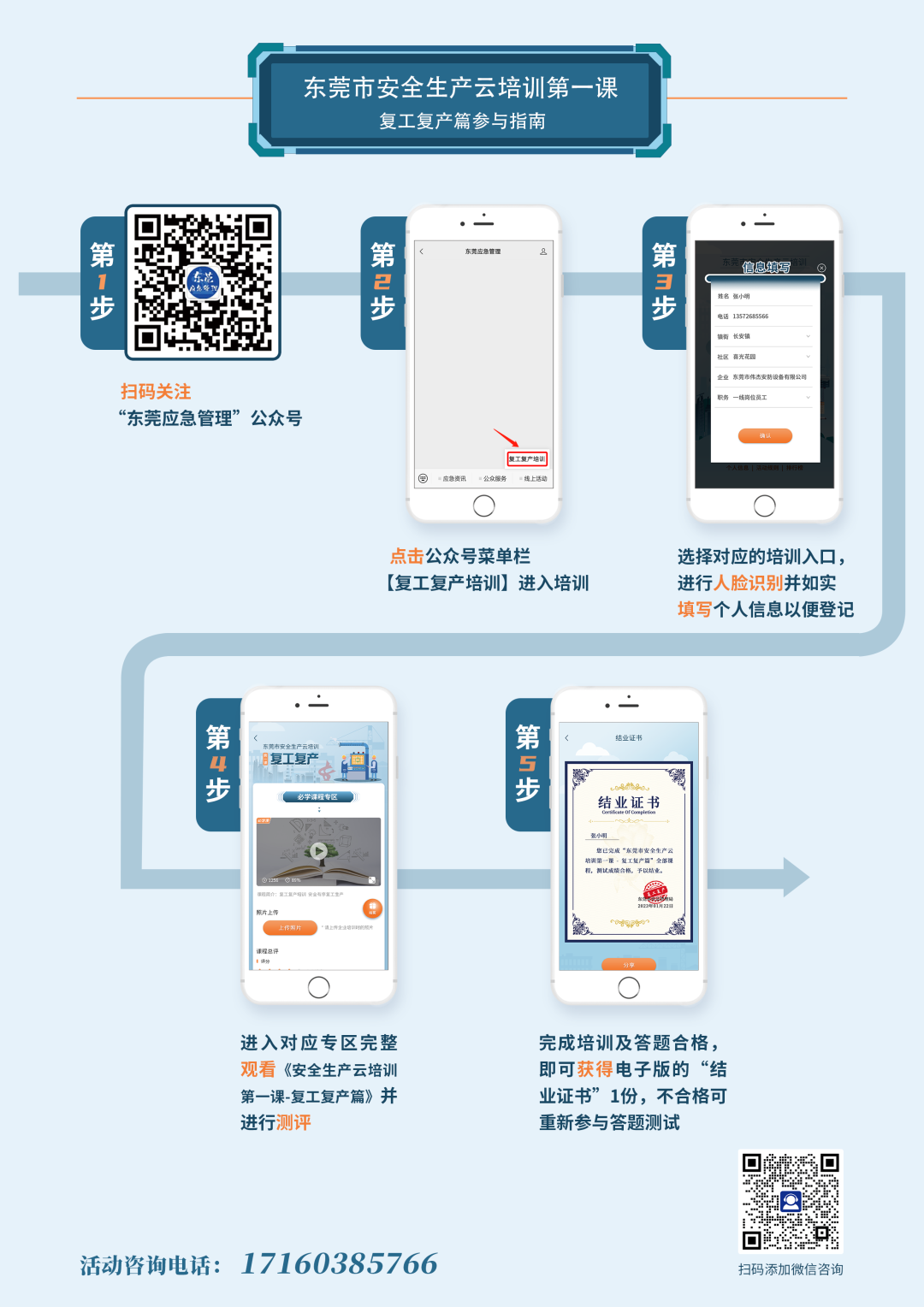 參與指南:關注“東莞應急管理”公眾號,通過點擊公眾號菜單欄【線上活動→復工復產(chǎn)培訓】,登記個人信息,完成注冊后,點擊“我要參加”進入培訓內容界面,點擊觀看視頻進行學習。