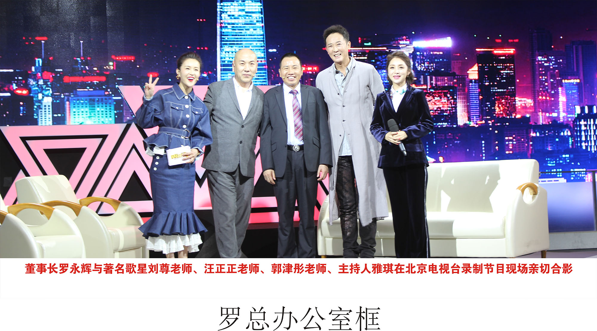 大道董事長羅永輝與著名歌星劉尊老師、汪正正老師、郭津彤老師、主持人雅琪在北京電視臺錄制節目現場親切合影